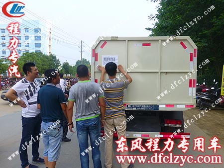 試完車,開始為東風銳鈴掛桶式垃圾車能順利的在路上行駛做準備了,上圖是客戶為東風銳鈴垃圾車貼上臨牌,確保新買車輛能正常在路上行駛。